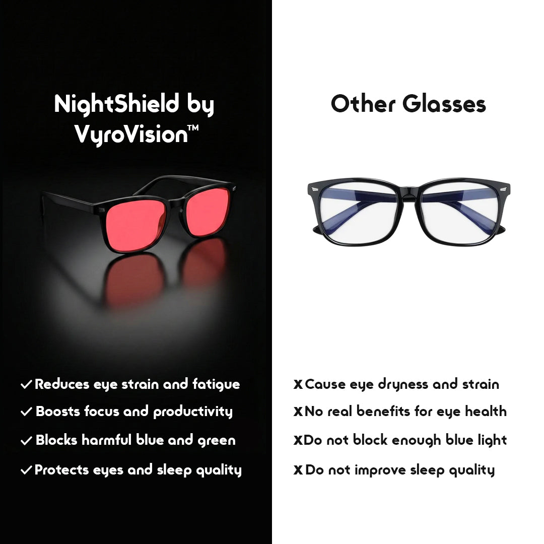 Blue light in the evening disrupts the body’s natural sleep cycle. By blocking that light, NightShield by Vyro™ helps your eyes relax and signals your brain to wind down.